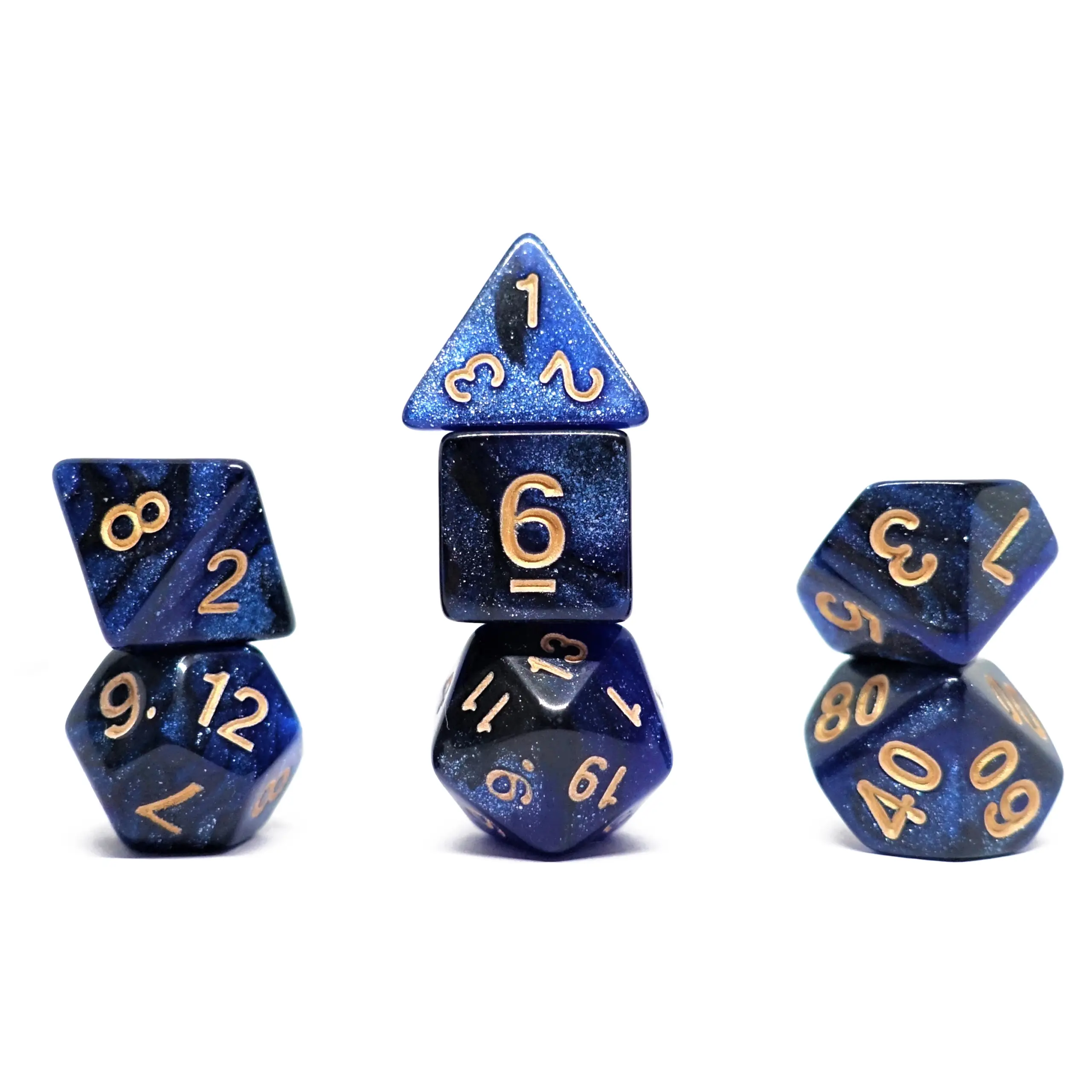 Darkest Depths dice set portrays the cosmic beauty of a moonless night. Its deep blue hue, akin to the vast firmament, is adorned with shimmering specks resembling distant stars.