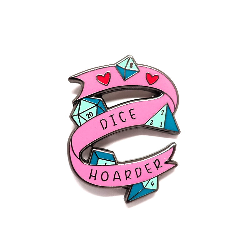 This bright and playful enamel pin proudly declares “Dice Hoarder”, wrapped in a pink banner surrounded by colourful polyhedral dice and tiny hearts. It’s the perfect badge for tabletop adventurers who absolutely do not need another set of dice… but will probably buy one anyway.