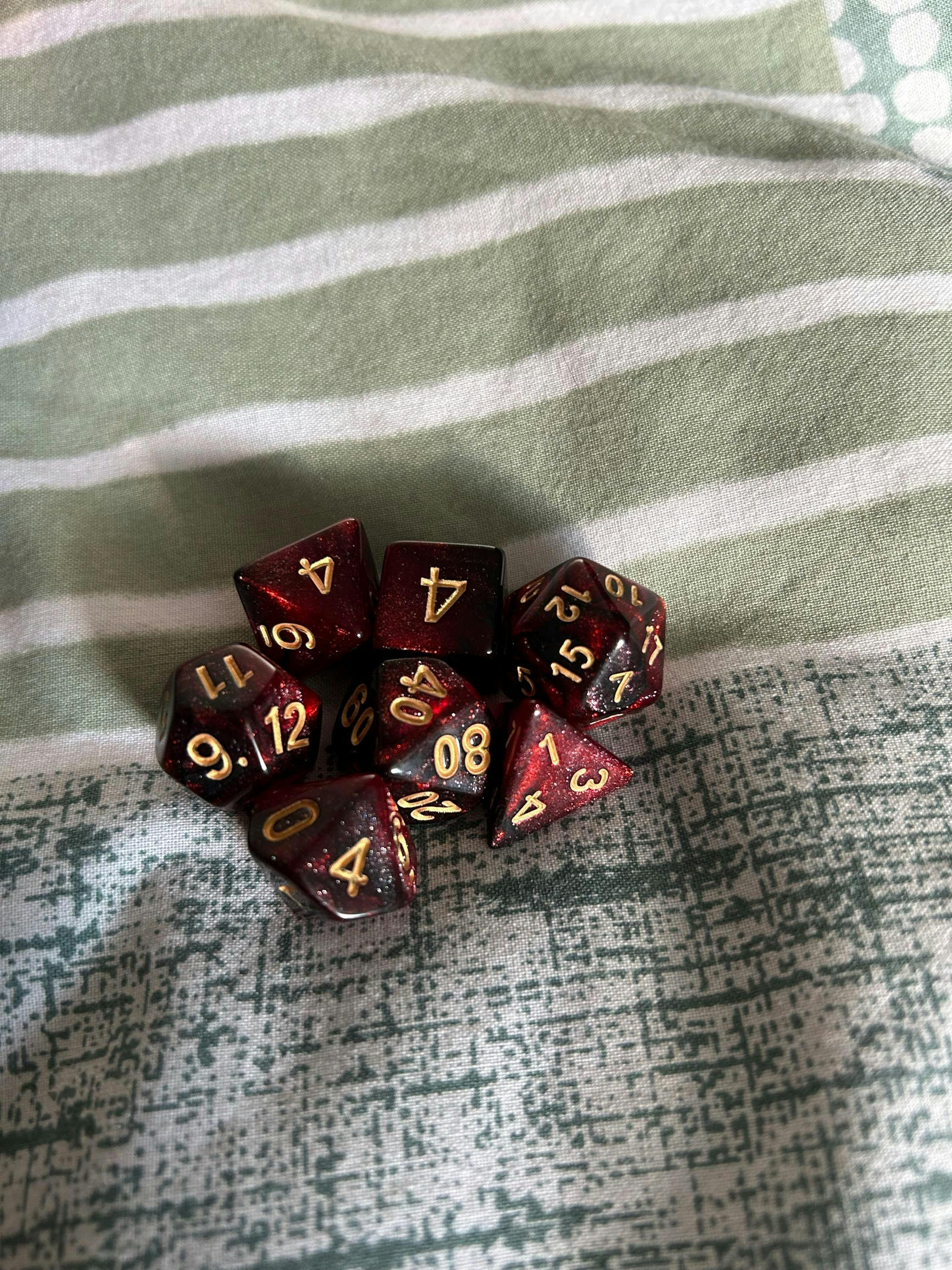 Nightmare a dice set encapsulating the mysterious depths of a haunting dream. The striking mix of black and dark red hues mirrors the enigmatic allure of a nightmarish realm.